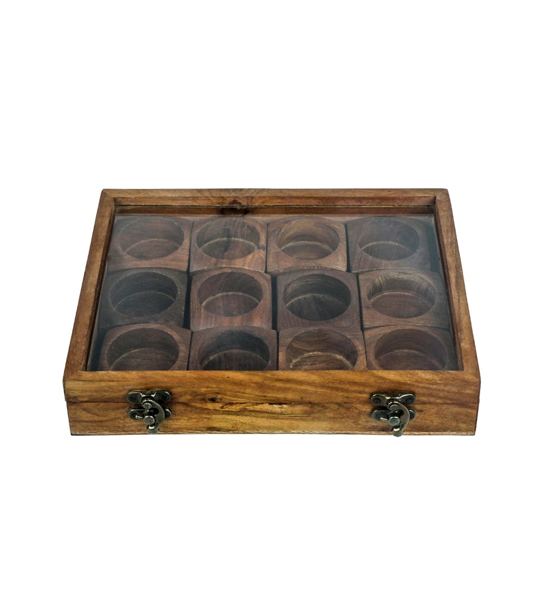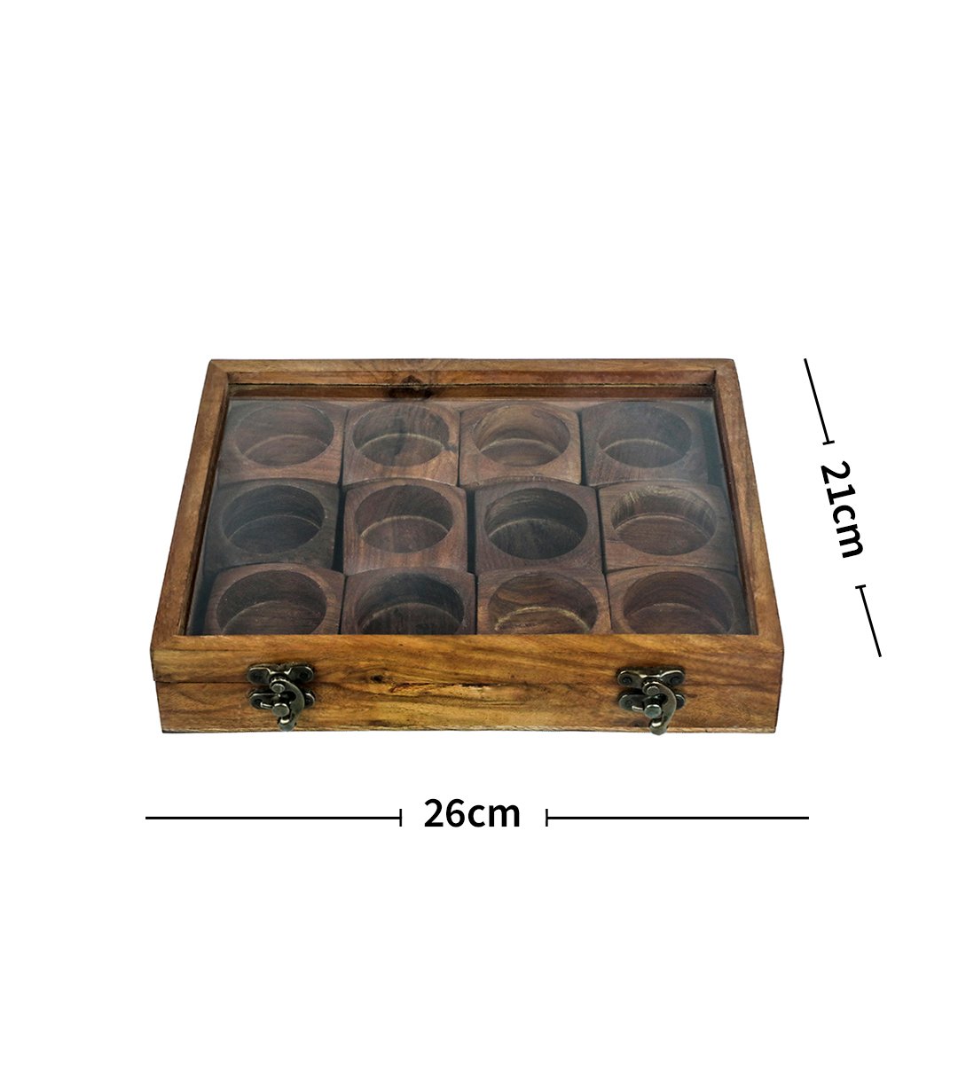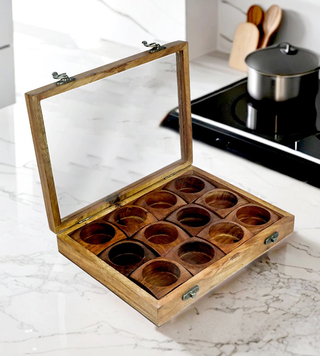 Wooden handcrafted spice box/ spice container with a closure transparent lid for kitchen and dining table (12 chambers)