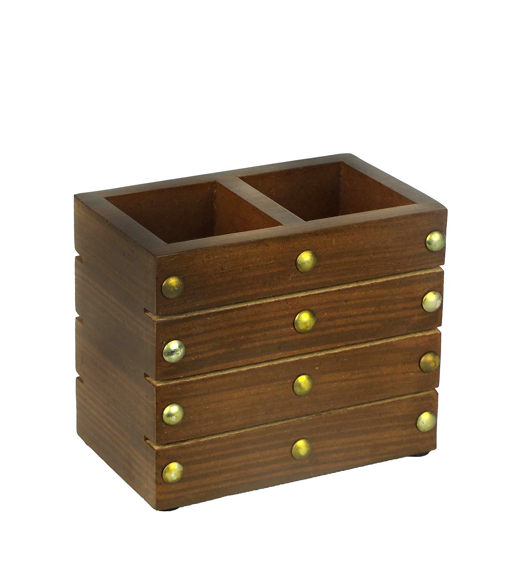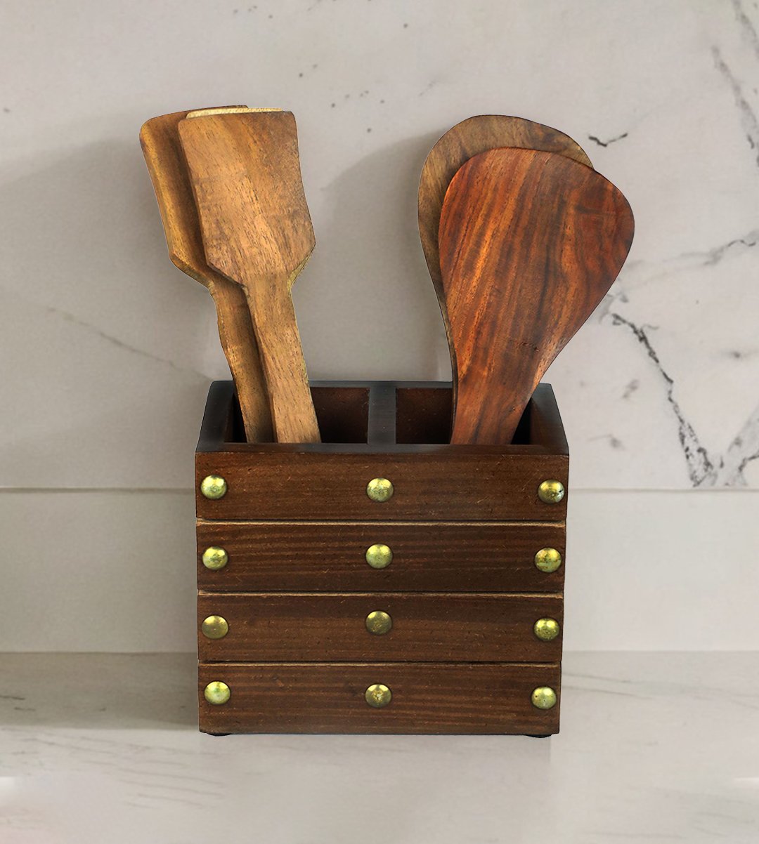 Wooden rectangular golden beads fixed ladle and spoon keeper/ pen container for home & kitchen decor (2 compartments)