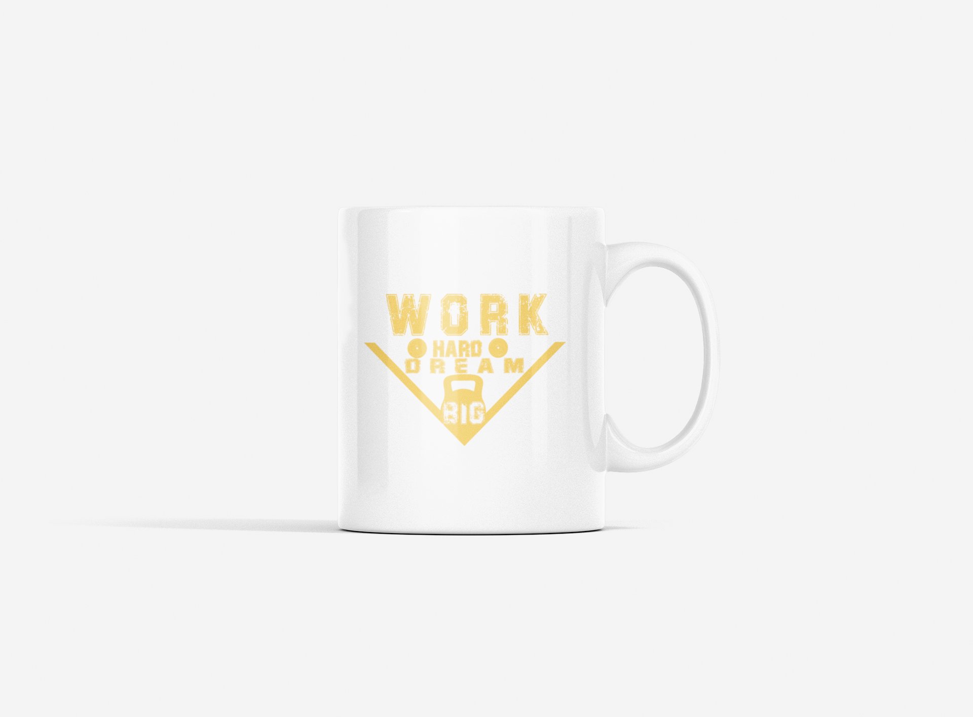 Work Hard, Dream Big, (BG Golden) - gym themed printed ceramic white coffee and tea mugs/ cups for gym lovers