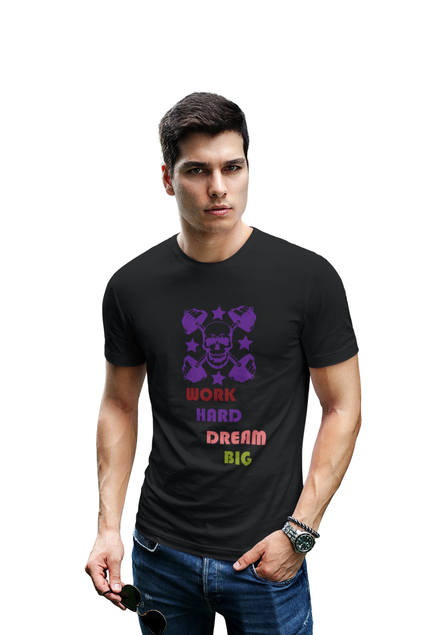 Work Hard, Dream Big, (BG Violet Skull), Round Neck Gym Tshirt (White Tshirt) - Clothes for Gym Lovers - Foremost Gifting Material for Your Friends and Close Ones