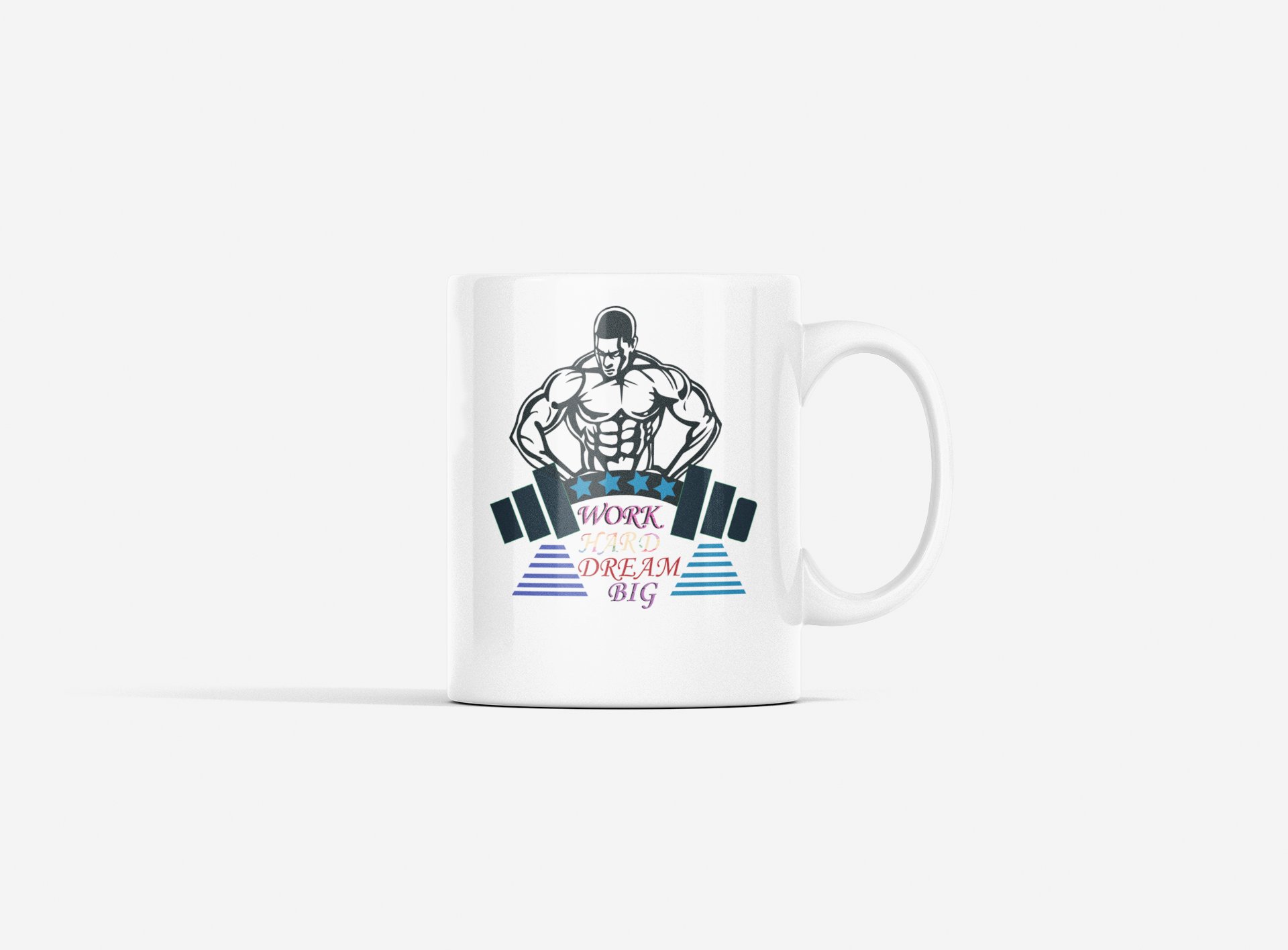 Work hard, Dream Big, Scattered Colourful Letters, (BG Black) - gym themed printed ceramic white coffee and tea mugs/ cups for gym lovers