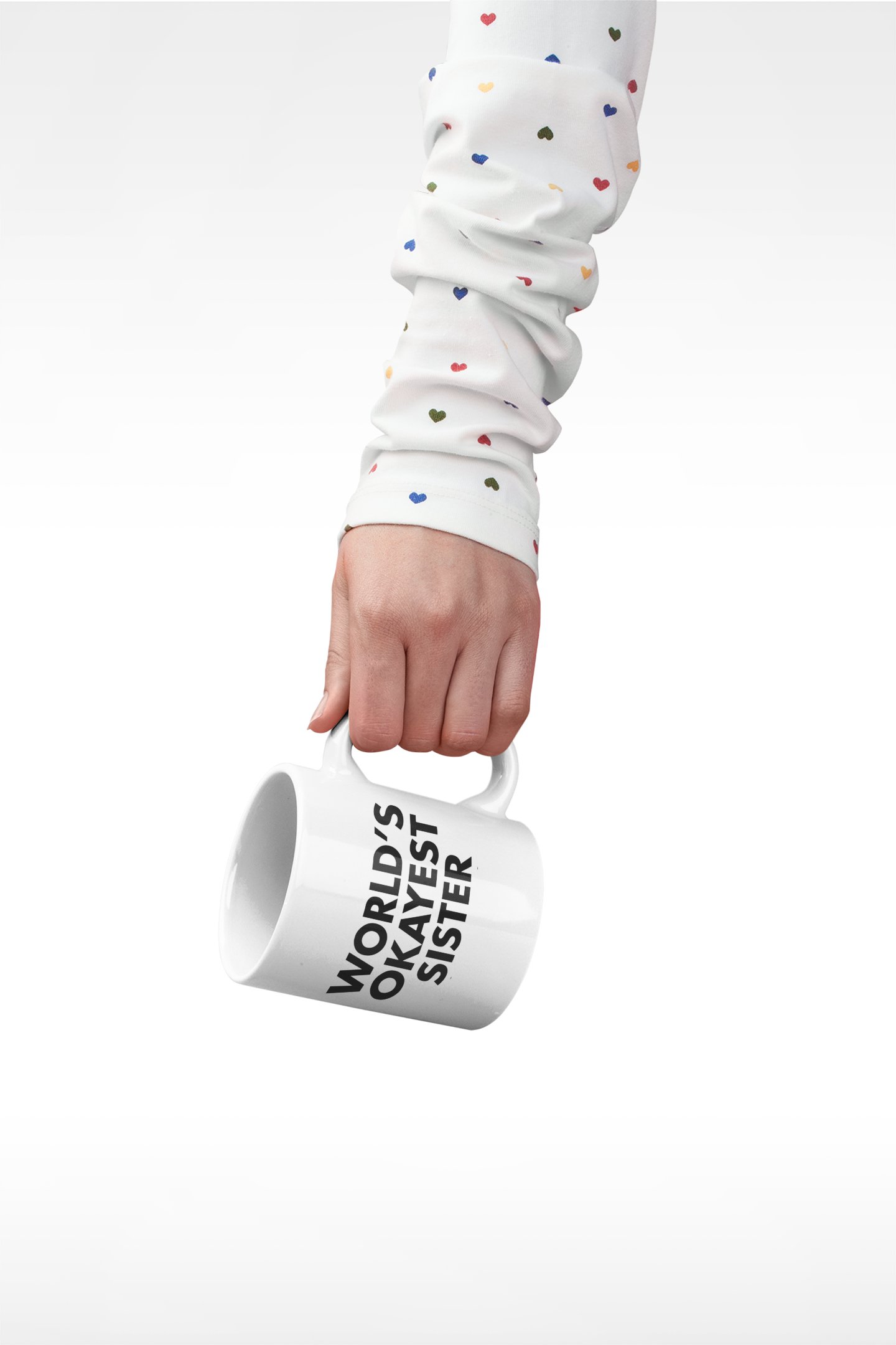 World's okayest sister Black text- family themed printed ceramic white coffee and tea mugs/ cups