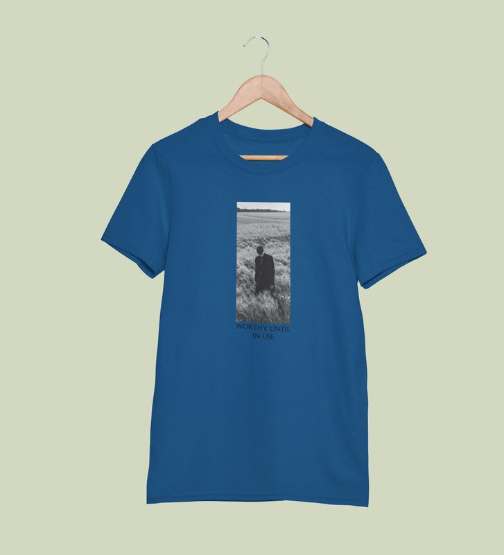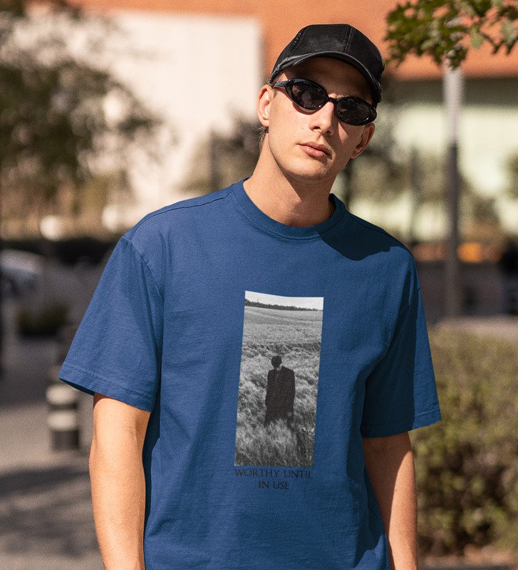 Worthless Life, Cityscape Elegance: Blue Men's Oversized Tee with Captivating Front Graphic