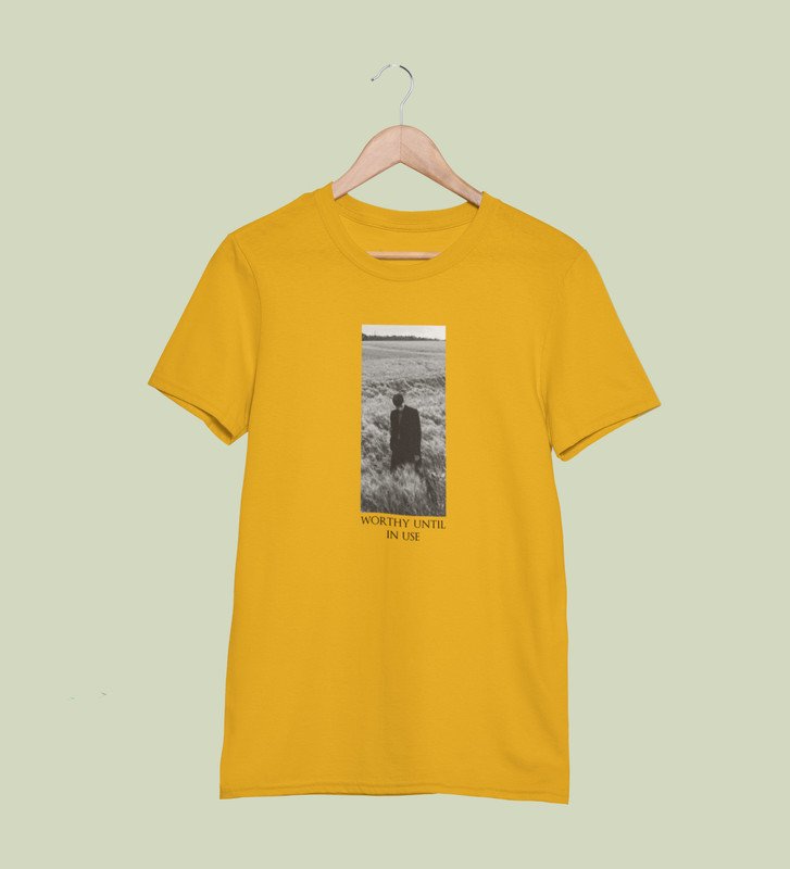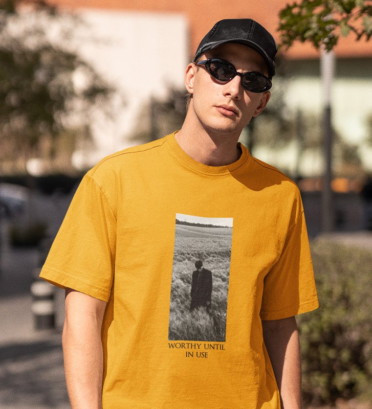 Worthless Life, Cityscape Elegance: Yellow Men's Oversized Tee with Captivating Front Graphic