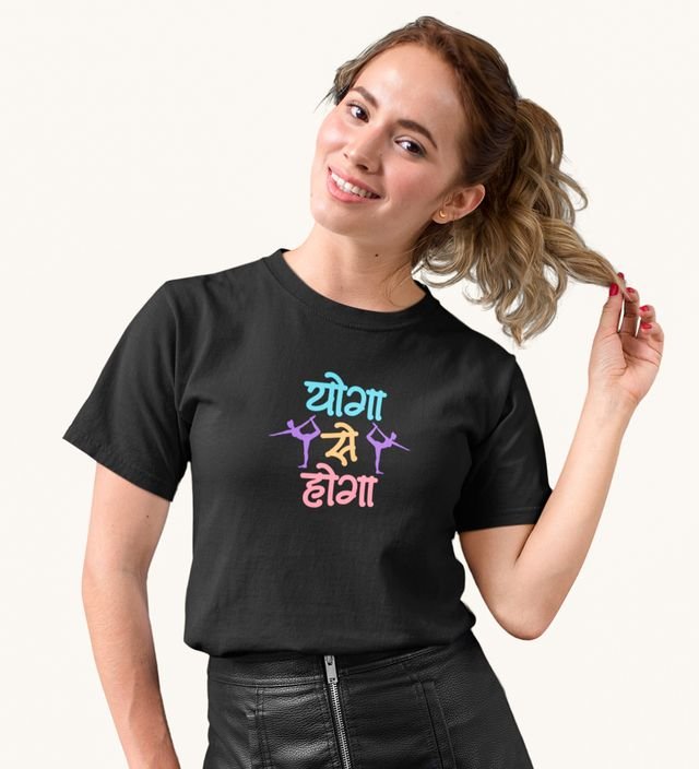 Yoga Se Hoga! Black Round Neck Cotton Half Sleeved WomenT-Shirt with Printed Graphics