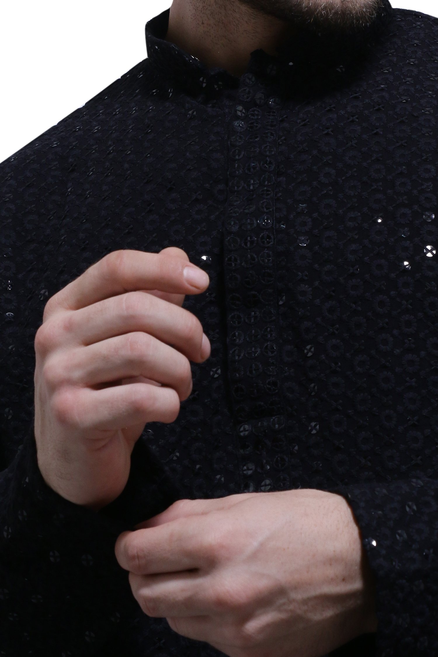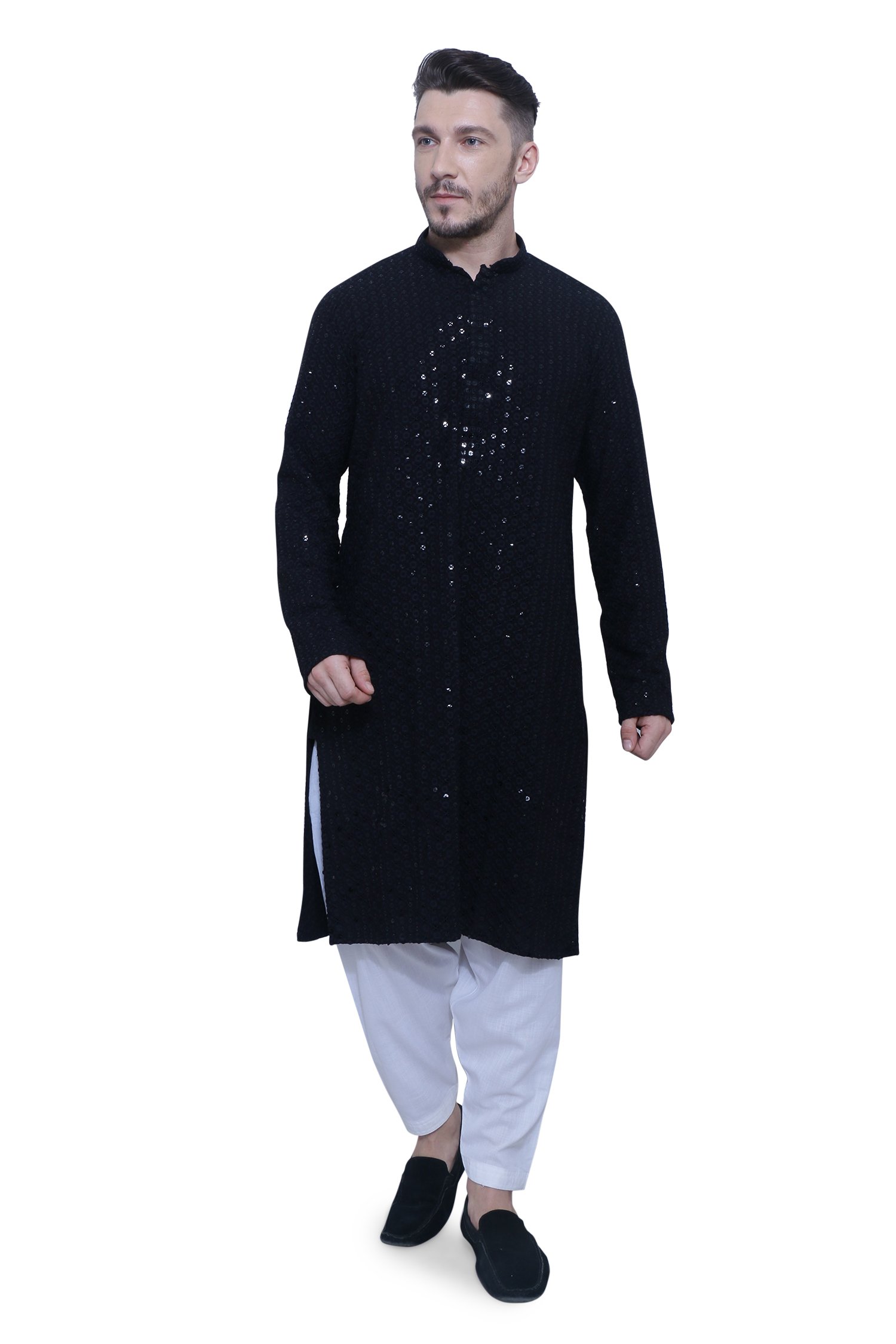 Embrace sophistication with our Sophisticated Black Chikankari Men's Kurta Set. Crafted from high-quality Chikankari fabric, this ensemble guarantees exceptional comfort. The classic Black color exudes elegance, and the intricate chikankari embroidery adds an authentic touch of craftsmanship.
